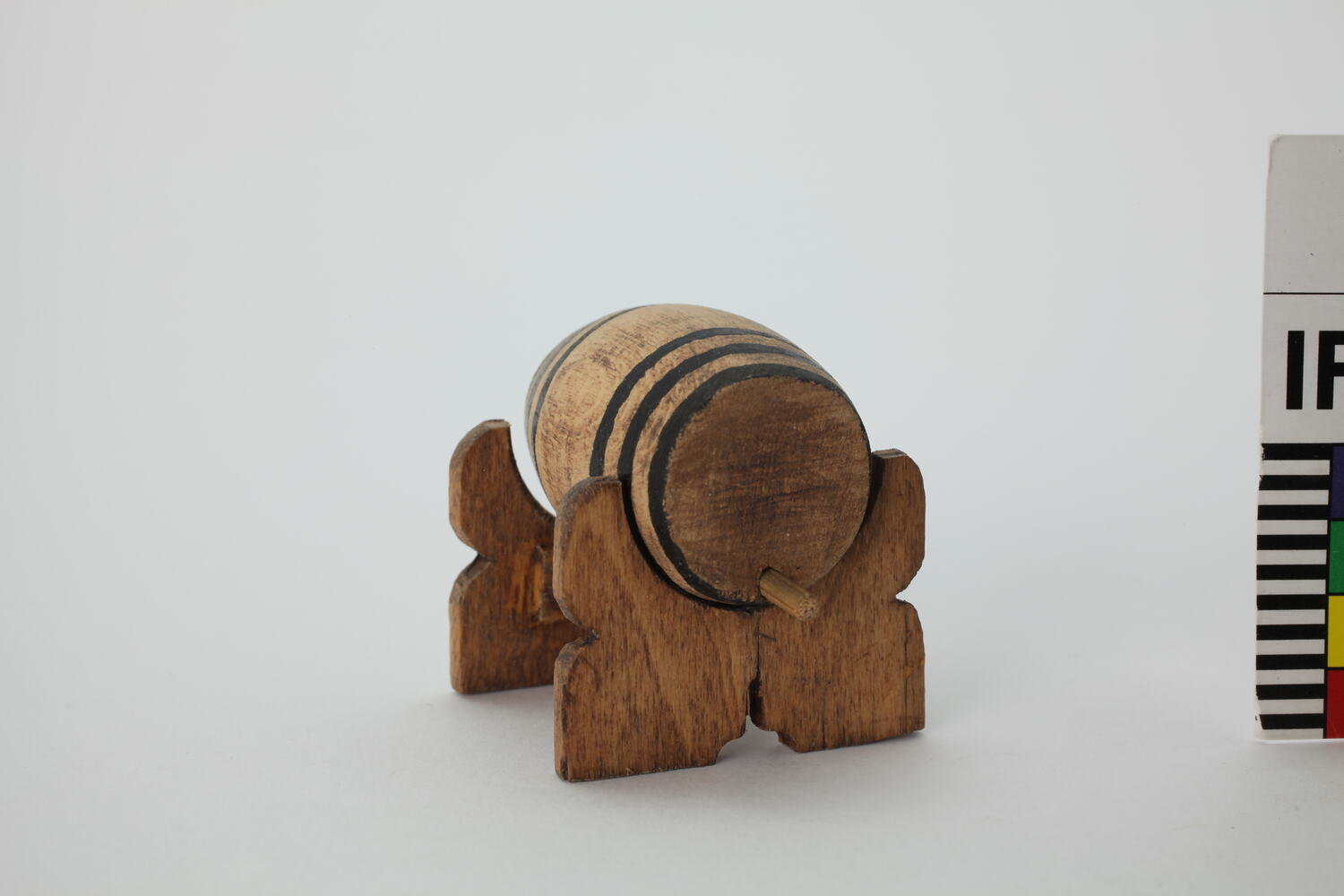 Round wooden barrel with three black bands at each end. Barrel has a small tap on lower edge.