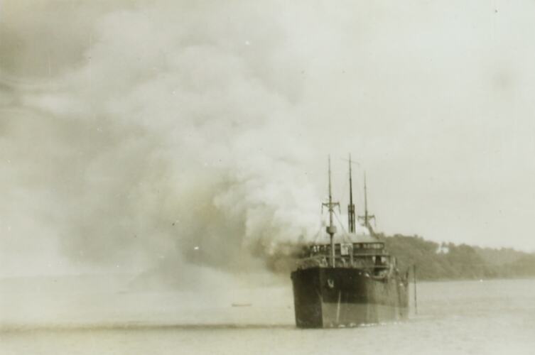 SS Nora Mulla is pictured in the ocean on fire. Smoke is shown to the left of image, land is pictured in the background.