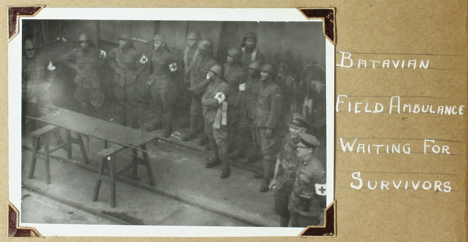 Image depicting the Batavian medical services awaiting the wounded survivors from the SS Nora Mulla (Nora Muller). The SS Nora Mulla (Nora Muller) was bombed by the Japanese on February 2, 1942, the HMAS Hobart and HMS Tenedos rescued 70 survivors from the striken ship.