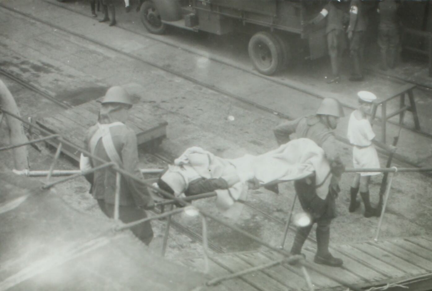 Two medical workers are pictured in the foreground carrying a badly burnt person on a stretcher from a ship. Batavian ambulances and medical workers are pictured in the background of image.