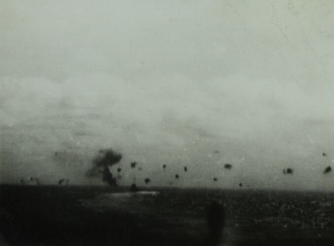 Image taken during the Battle of the Coral Sea. Explosions and smoke pictured at sea.