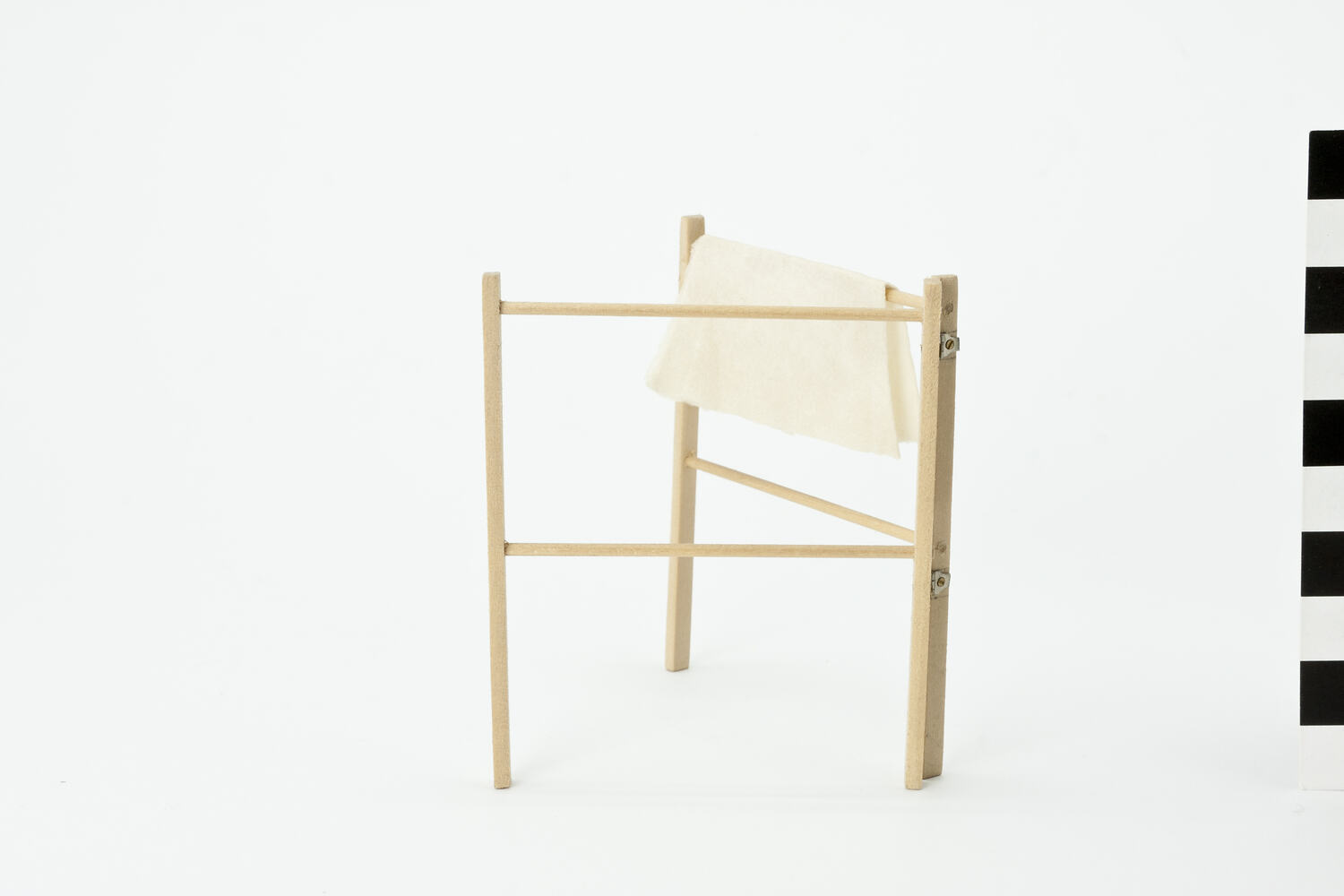 Wooden clothes airer. Two hinged sections with two rails each. A sheet hanging on top rail of one section.