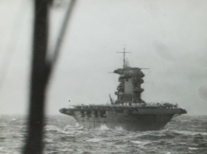 Black and white photograph from a photography album by David Ralph Goodwin, RAN. The album contains 108 black and white photographs from World War II, many highly significant, showing sea battles (live fire), survivors, wounded and the dead being buried at sea. The photographs are secured with photo corners - a few now adrift. Includes images of German troops evacuating from Greece; German airborne troops in front of Junkers; airborne assault on Crete; Singapore burning; and later actions in Coral Sea. Includes a photo of HMAS Canberra, which was sunk on 9 August 1942, in the Battle of Savo Island.