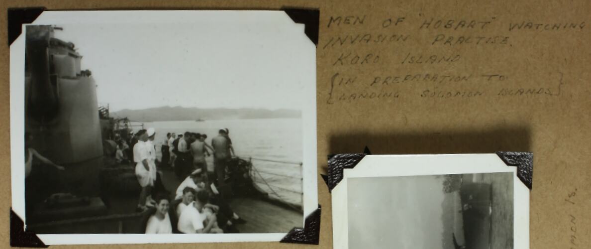 Handwritten in black ink to the right photograph: 'MEN OF "HOBART" WATCHING / INVASION PRACTISE. / KORO ISLAND / {IN PREPARATION TO / LANDING SOLOMON ISLANDS}' Handwritten in grey pencil on the back of photograph: 'Watching practise / landing at Koro Island'