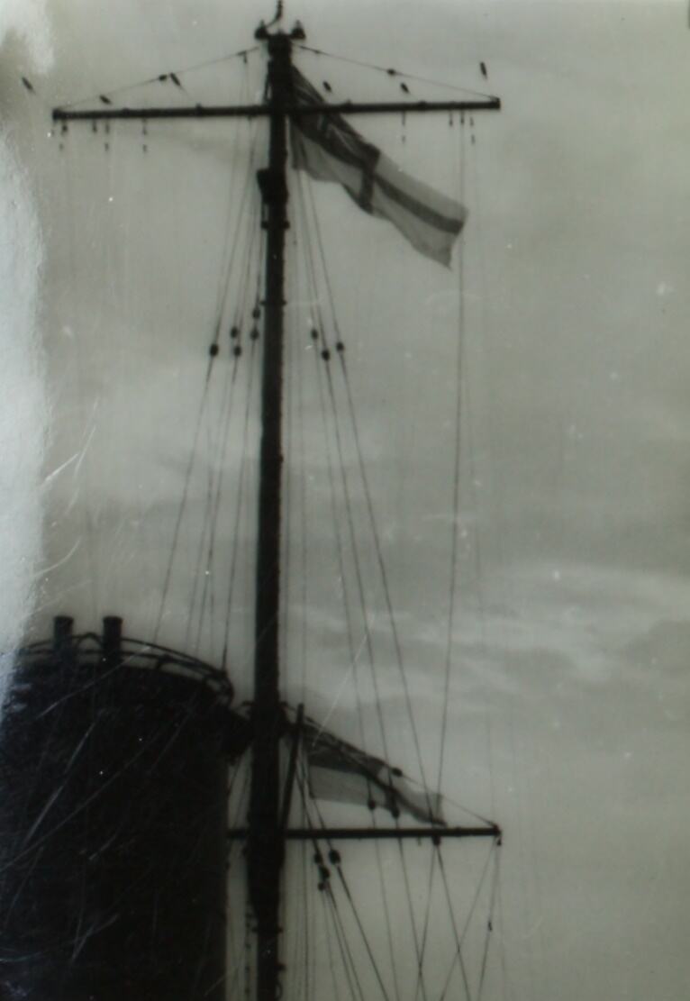 Image from the time that Goodwin served on the HMAS Hobart depicting the "Battle Ensign" of the HMAS Hobart. According the inscription the ensign was flown for the invasion of the Solomon Islands. Although the HMAS Hobart provided cover for the invasion of Singapore, she was not present at the Battle of Savo Island when the USS Astoria and the HMAS Canberra were lost on August 9, 1942.