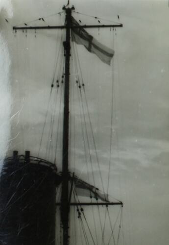 Battle ensign is pictured. Image taken looking up towards flag. Ropes and mast are also shown in image.