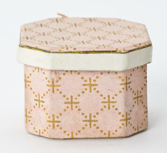 Pink & Gold Hat box from Room 10 - Linen Room, Basement Right Section, Pendle Hall. From top of linen cupboard.