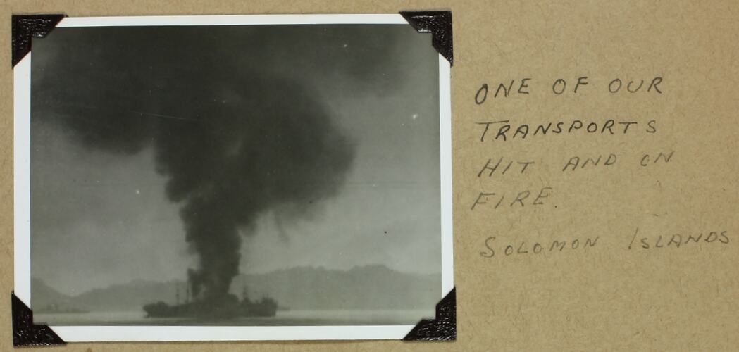 Handwritten in black ink to the right of photograph: 'ONE OF OUR / TRANSPORTS / HIT AND ON / FIRE. / SOLOMON ISLANDS' Handwritten in grey pencil on the back of photograph: 'Onf of our / transports hit / Invasion of Solomons' Handwritten in blue pencil on the back of photograph: '36' Printed in blue ink on the back of photograph: 'SUITABLE FOR TRANSMISSION THROUGH / THE POST (NOT FOR PUBLICATION)' Printed in red ink on the back of photograph: 'NOT'