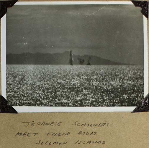 Handwritten in black ink below photograph: 'JAPANESE SCHOONERS / MEET THEIR DOOM / SOLOMON ISLANDS' Handwritten in grey pencil on the back of photograph: 'Jap. schooner being fired / on by American Destroyer / Invasion of Solomons / All land seen in / these photos is / Guadacanal' Handwritten in blue pencil on the back of photograph: '25' Printed in blue ink on the back of photograph: 'SUITABLE FOR TRANSMISSION THROUGH / THE POST (NOT FOR PUBLICATION)' Printed in red ink on the back of photograph: 'NOT'