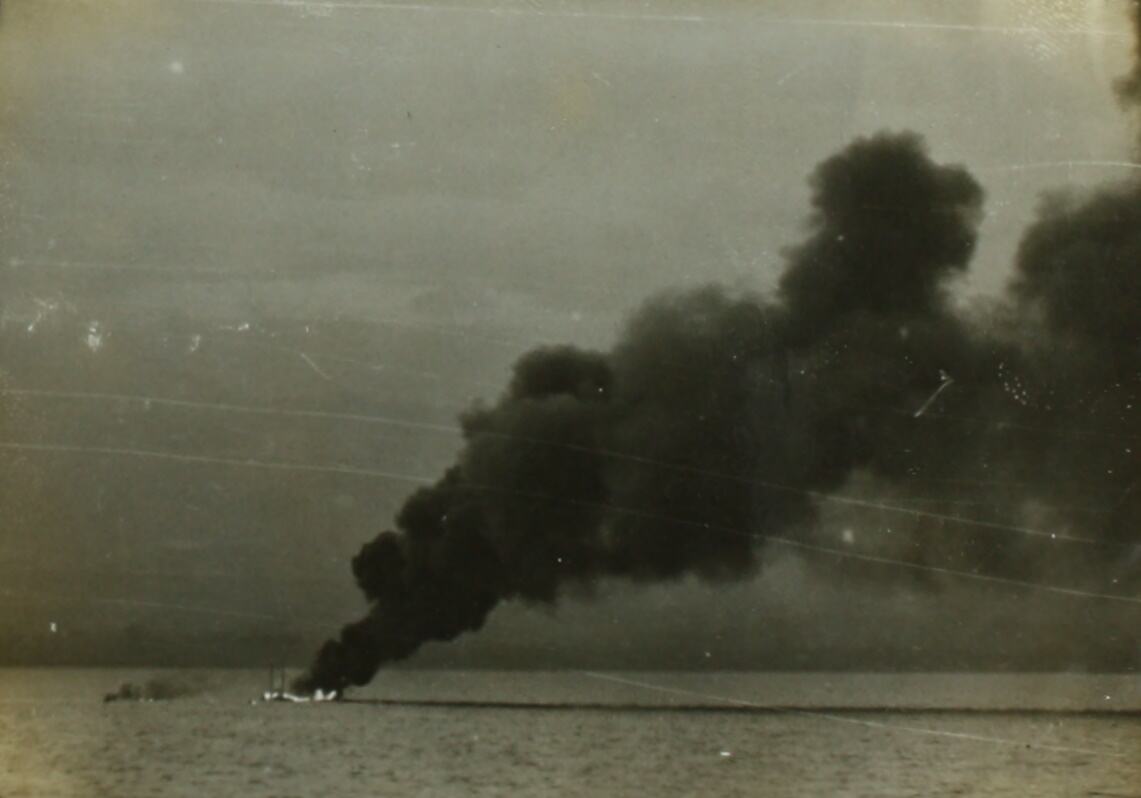 A Japanese schooner is pictured on fire at the Battle of the Coral Sea. Smoke is pictured above the schooner. Land is shown in the background of image.