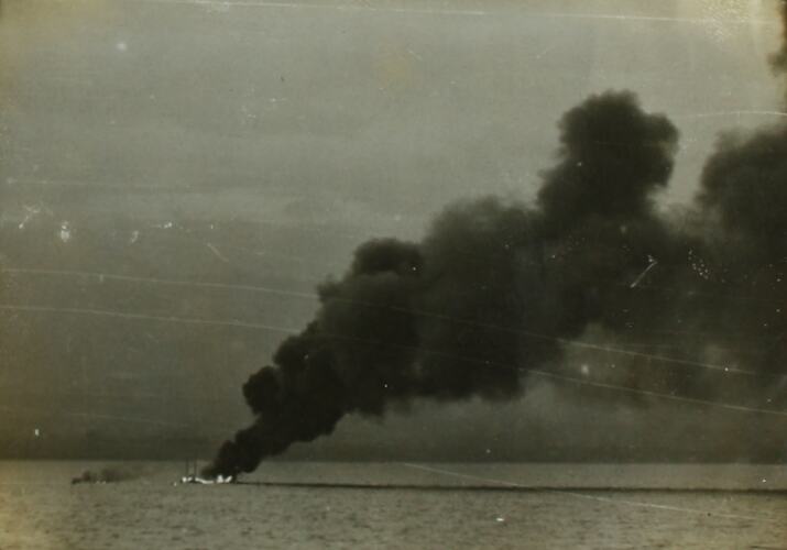 Image depicting a Japanese schooner on fire, presumably after the bombing by an American destroyer in the previous image (MM 112343).