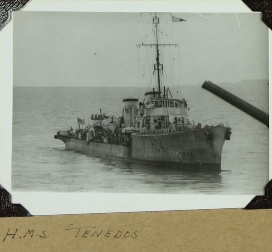 Handwritten in black ink below photograph: 'H.M.S. / TENEDOS' Handwritten in grey pencil on the back of photograph: 'H.M.S. "Tenedos"'
