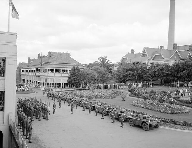 A military demonstration is pictured in a courtyard at Heidelberg Hospital. Soldiers in formation and military vehicles are shown to the left of image. Patients and nurses are shown surrounding the courtyard area, watching the display.