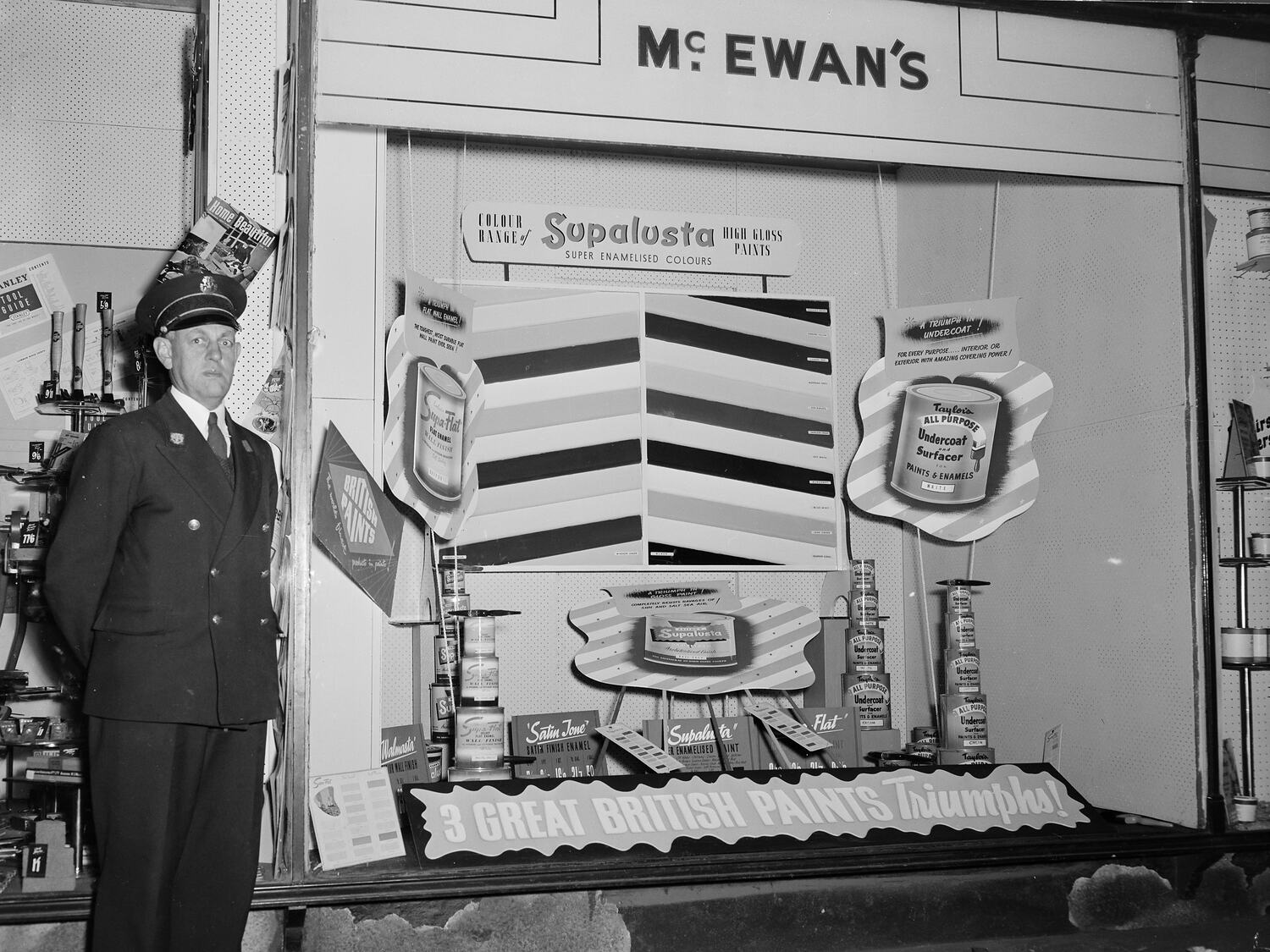 A man in uniform is standing next to a McEwans Hardware window display. The window display shows products, packaging and advertising signs for British Paints.