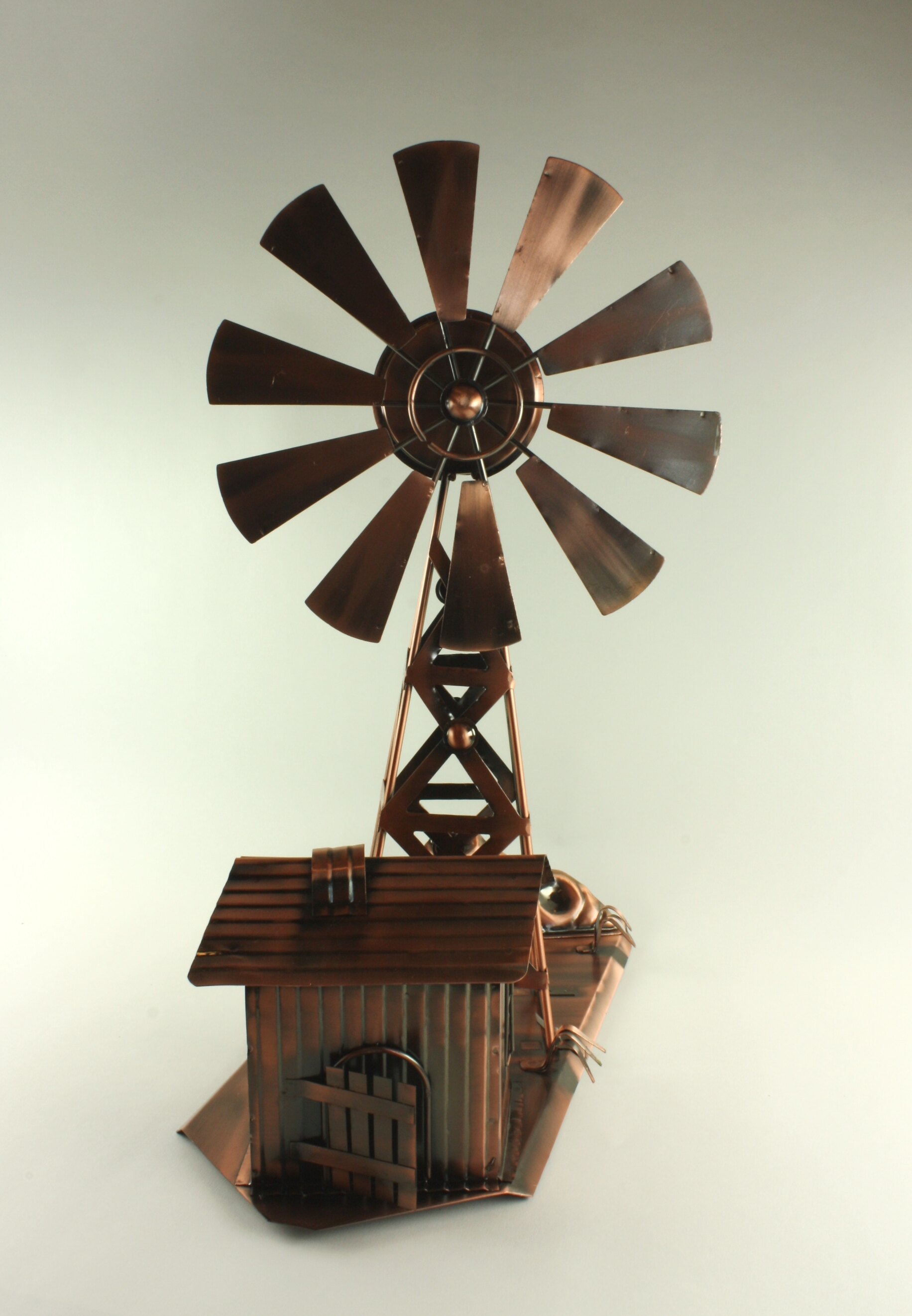 A two-part model designed for assembly and to be left assembled. Made of copper finished sheet metal, dark grey on underside. 1. Model consists of a flat sheet, turned down at edges to raise the sheet from display surface. At the 'rear' a separate sheet stamped to resemble rocks has been spot welded to the base, together with 2 'tufts' of grass. On the base there are 4 strips of metal welded at one end only. They have been shaped to accommodate the base of the windmill structure and then probably welded or glued to the base. At the 'front' a model of a hut has been fixed to the base by means of a flange. The hut has a door and 2 windows suggested by strips of wire bent to shape. The window spaces have been roughly cut out and the doorway has a post and rail style door ajar, welded to the front wall.