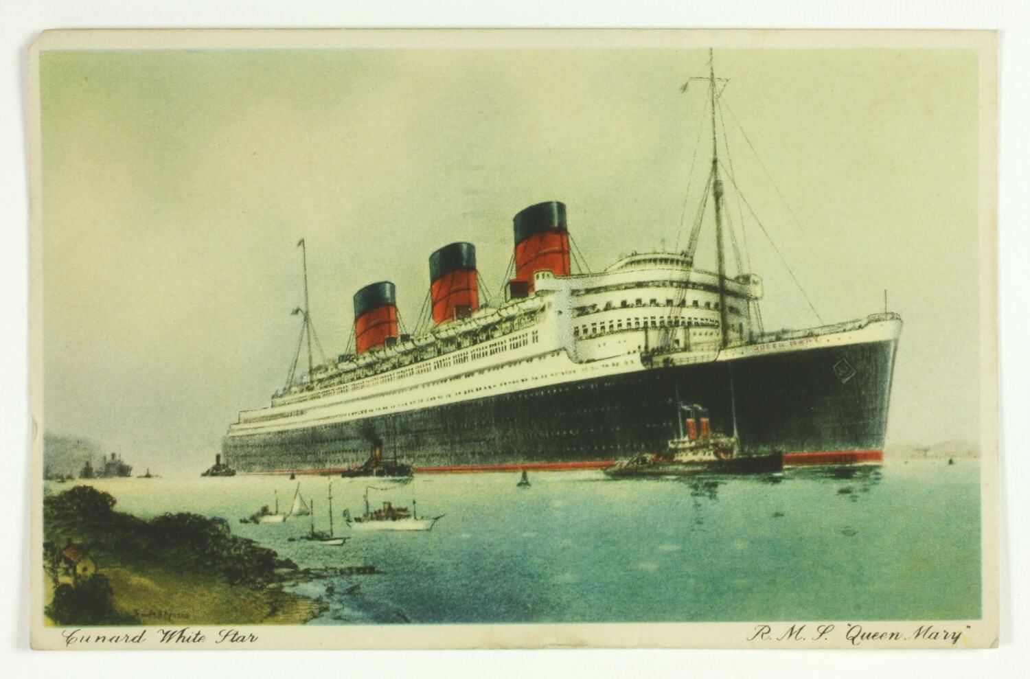 Postcard featuring a colour illustration of the RMS 'Queen Mary', Cunard White Star, written 24 July 1938 on board the ship RMS Queen Mary, and sent from Southampton in the United Kingdom on 25 July 1938 by Mr Edgar Rouse, the Chief Managing Director of Kodak Australasia, to Mr Harry Clarke Junior.