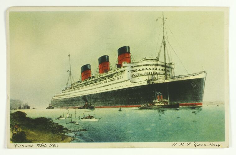 Text, printed front: Cunard White Star R.M. S. "Queen Mary". Back, bottom left, blue ink, handwritten: 'From / Edgar Rouse / RMS "Queen Mary" / 24-7-38' Back, bottom right, blue ink, handwritten: 'Harry Clarke Jnr. / Yarra Grange / P.O. Box 11 / Abbotsford N9 / Victoria / Australia' Back, top middle, black ink, stamped: [around inside edge of circle] 'SOUTHAMPTON PA.QUEBOT / [in middle of circle] 25 JULY / 1938'