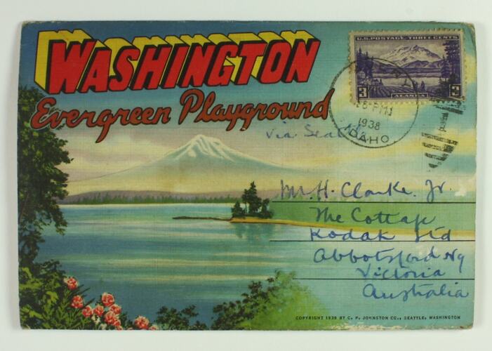 Postcard folder featuring colour postcards of Washington in the USA. The postcard booklet was sent in 1938 by Mr Edgar Rouse, Kodak Australasia Chief Managing Director, to Mr H Clark Jnr. The postcard folder was sent while Mr Rouse was on a business trip in 1939 to the Eastman Kodak headquarters at Rochester, New York in the USA. While in the USA Mr Rouse travelled to other destinations. The postmark on the postcard booklet was stamped Idaho but Mr Rouse noted on the front of the envelope 'via Seattle', suggesting he travelled to both Washington and Seattle.