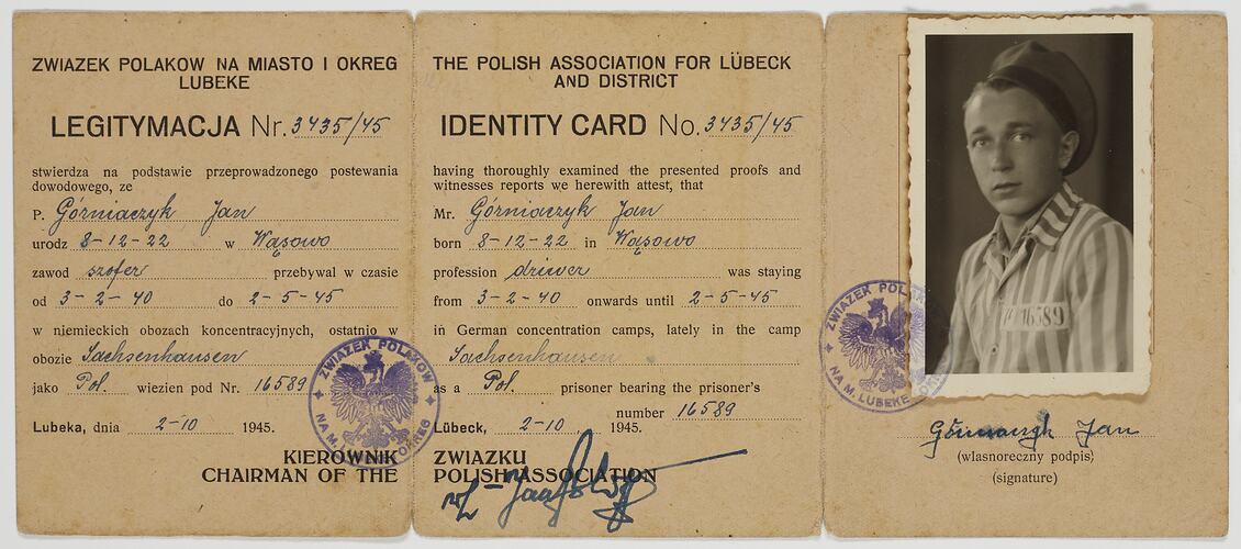 The card has inscriptions on all of its six faces, except for the second face of the back side. The text is half printed in black ink and half handwritten in blue ink. Front side, first face: ZWIAZEK POLAKOW NA MIASTO I OKREG LUBEKE / LEGITYMACJA NR. 3435/45 / stwierdza na podstawie przeprowadzonego postewania dowodowego, ze P. Gorniaczyk Jan urodz 8-12-22 w Wasowo zawod szofers przebywal w czasie w niemieckich obozach koncentracyjnych, ostatnio w obozie Sachsenhauser jako Pol. wiezien pod Nr. 16589 / Lubeka, dnia 2-10 1945. Front side, second face: THE POLISH ASSOCIATION FOR LUBEKE AND DISTRICT / IDENTITY CARD No. 3435/45 / having thoroughly examined the presented proofs and witnesses reports we herewith attest, that Mr. Gorniaczyk Jan born 8-12-22 in Wasowo profession driver was staying from 3-2-40 onwards until 2-5-45 in German concentration camps, lately in the camp Sachsenhausen as a Pol. prisoner bearing the prisoner's number 16589 / Lubeck 2-10 1945. Front side, spanning over the first and second face: KIEROWNIK ZWIAZKU / CHAIRMAN OF THE POLISH ASSOCIATION (ILLEGIBLE SIGNATURE). Front side, third face: Round purple stamp of an outstretched bird over the black and white photograph of Mr. Gorniaczyk. The stamp reads: ZWIAZEK POLAKOW / NA M. LUBREKE / Gorniaczyk Jan / (wlasnoreczny podpis) (signature). Back side, first face: Typed text: Na zarzadzenie Wladz Wojskowych okazicielowi niniejszego dowodu przysluguje prawo pierwszenstwa. Nalezy mu okazywac wszelka pomoc. / By order of the Military Government the bearer of this pass must receive privilege and help. / Inhaber dieses Passes ist auf Anordnung der Mil.- Behorde zu bevorzugen. Ihn ist jede Hilfe zu gewahren. / Stamped black text: POLISH LIAISON OFFICER 626 MIL. GOV./R/D(Illegible letter)T. / (Illegible signature) Back side, second face: No inscriptions. Back side, third face: Blue stamped text: Oswobodzony przez Aliantow / Liberated by Allies.