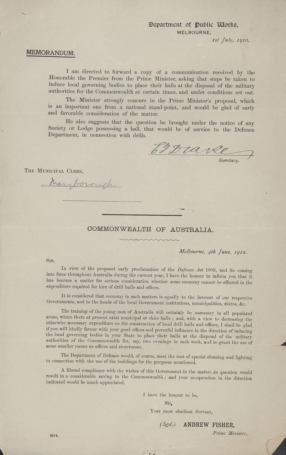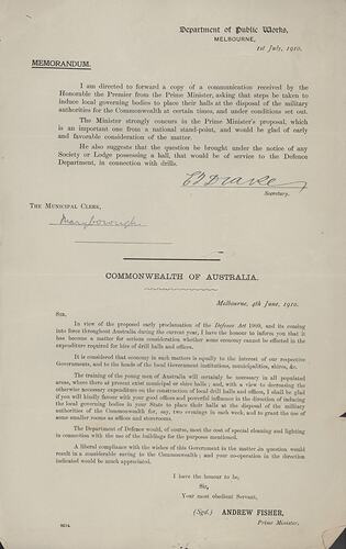 Folio-sized cream-coloured paper memorandum printed in black. The memorandum, addressed to the Municipal Clerk of Maryborough from the Secretary of the Department of Public Works, induces local authorities to place their halls at the disposal of military authorities for drilling. The memorandum includes a letter from Prime Minister Andrew Fisher, explaining why the halls are needed: