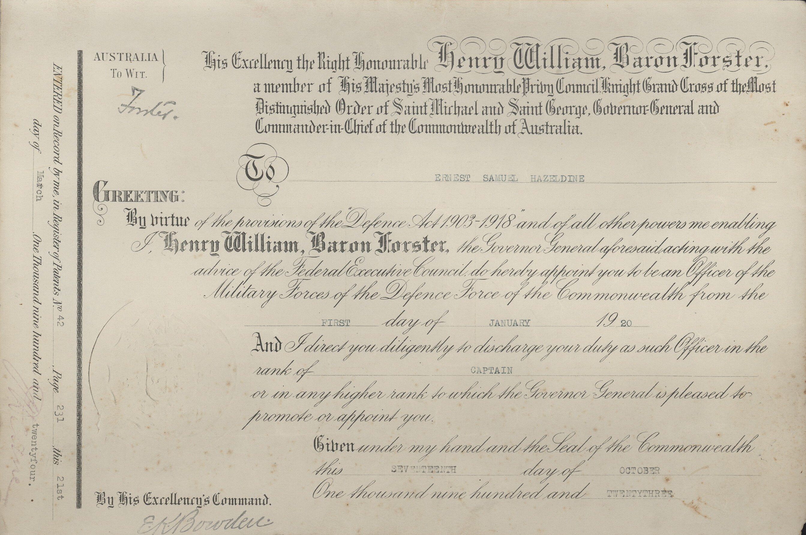 Printed paper certificate confirming the commission of Ernest Samuel Hazeldine as Captain, Defence Force of the Commonwealth, 1 January 1920. The certificate is dated 17 October 1923; the appointment was recorded in the 'Register of Patents', no. 42, page 231, on 21 March 1924. The certificate is authorized by the Governor-General, Henry William, Baron Forster.