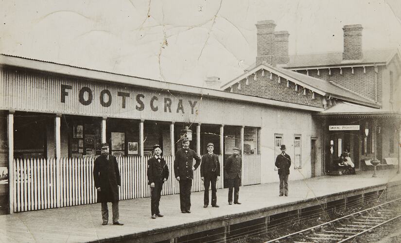 Black and white photograph of staff at Footscray Railway Station, circa 1900.