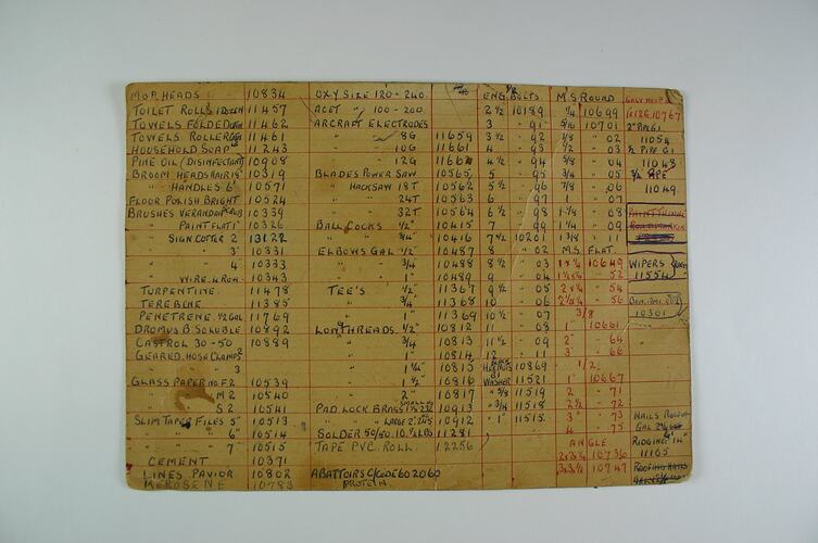 Supply list with descriptions of products, codes and sizes. Items include turpentine, cement and floor polish. Affixed to masonite notice board hung in Administration Offices at Newmarket Saleyards.