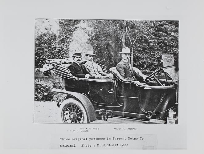 Printed in black on label below image in photograph: 'MR. W. S. ROSS / MR. W. H. LEWIS / MAJOR H. TARRANT / Three original partners in Tarrant Motor Co / Original Photo : Mr W.Stuart Ross'