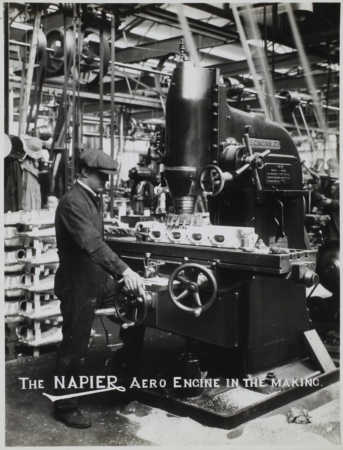A workman operating a milling machine during manufacture of a cylinder head for a Napier Lion aero engine at Acton, West London.