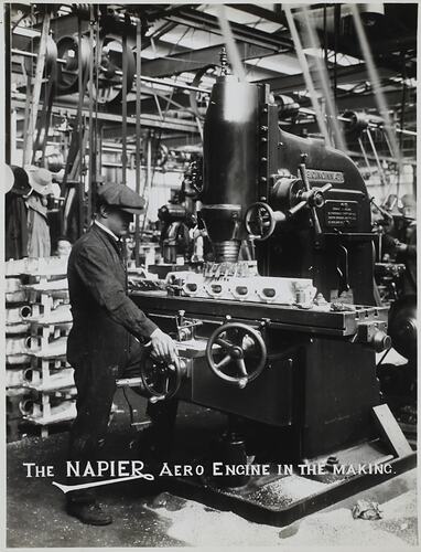 Printed in white text on photograph: 'THE NAPIER AERO ENGINE IN THE MAKING.' Hand written in grey pencil on back of photograph: '288' Printed in purple ink on back of photograph: 'Photograph by / "Bridge Studios Ltd." / 2, Denman St, / London, S. E'