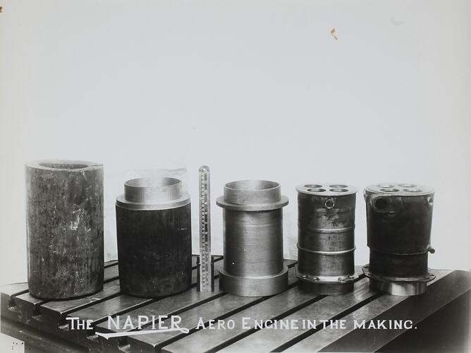 Printed in white text on photograph: 'THE NAPIER AERO ENGINE IN THE MAKING.' Hand written in grey pencil on back of photograph: '289' Printed in purple ink on back of photograph: 'Photograph by / "Bridge Studios Ltd." / 2, Denman St, / London, S. E'