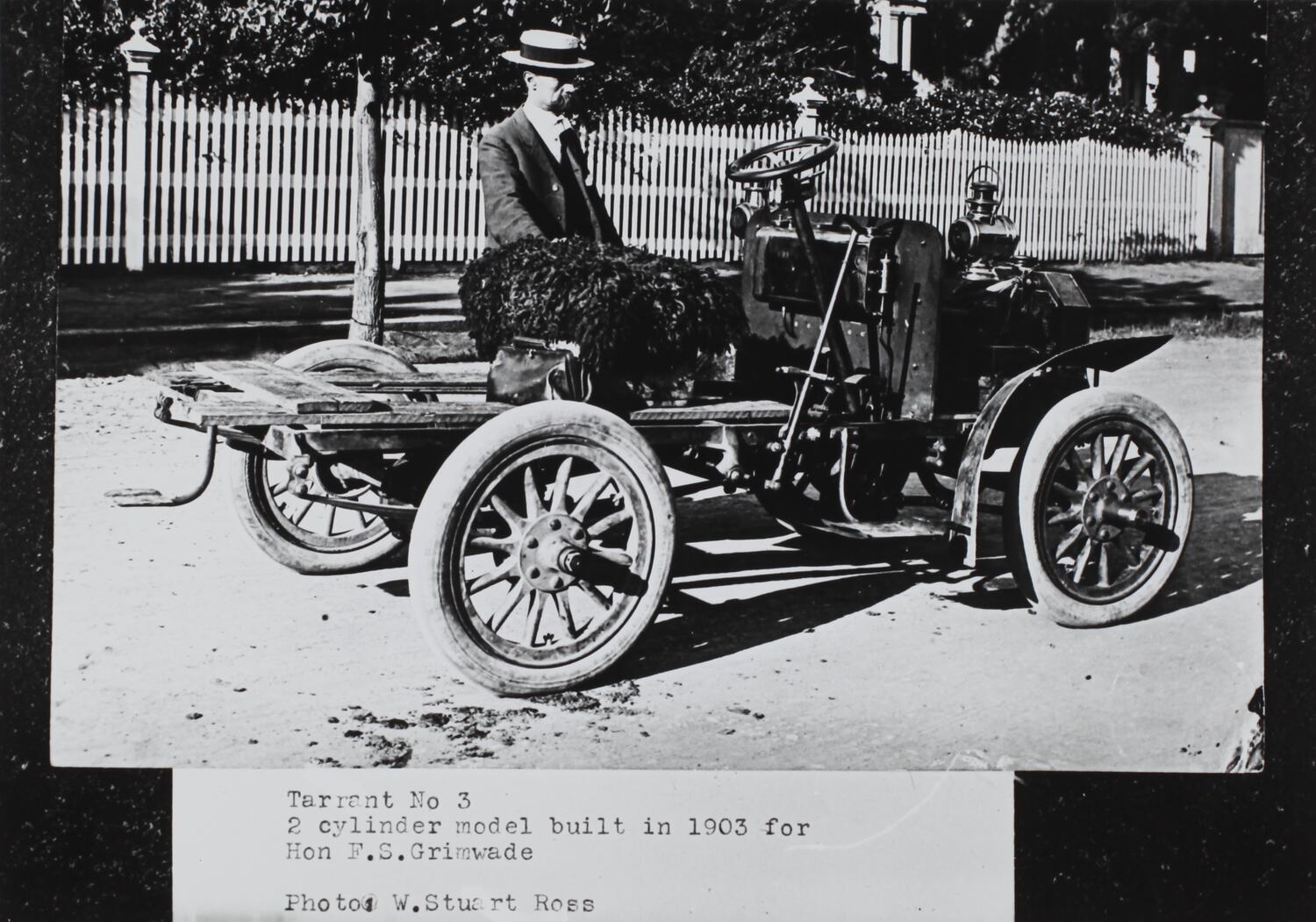 Photograph of image and text. Image shows a Tarrant No. 3 motor car on display, a 2 cylinder model. Built in 1903 for the Hon F. S. Grimwade.