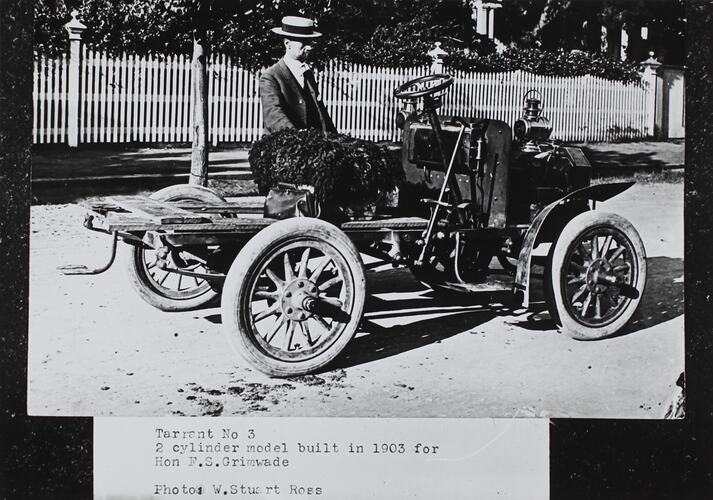 Printed in black on label below image in photograph: 'Tarrant No 3 / 2 cylinder model built in 1903 for / Hon F.S.Grimwade /