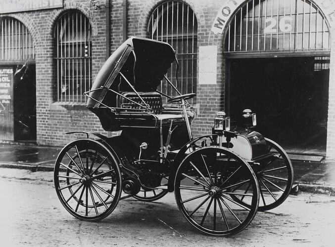 A new Haines & Grut motor buggy pictured in A'Beckett Street, Melbourne parked in front of a brick automotive workshop building. This vehicle is now held in the collection of Museum Victoria.