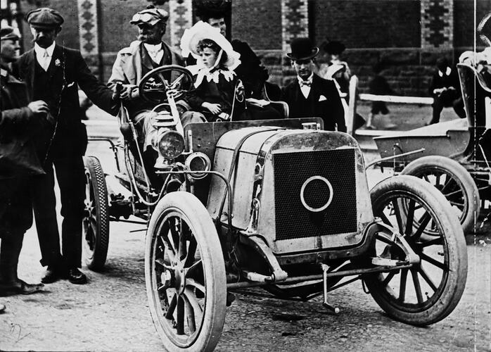 Printed in black on label below image in photograph: 'Tarrant No 6 / 2 cyl 10 h.p.which won the 1905 Dunlop. / Reliability Trial -Melbourne to Sydney & back. / People illustrated from l to rt. Mr Joe Tarrant / Manager, Accessory Dept, at the wheel Capt / Harley Tarrant, with his wife & daughter. / Car price £375 (Photo:W.Stuart Ross)'