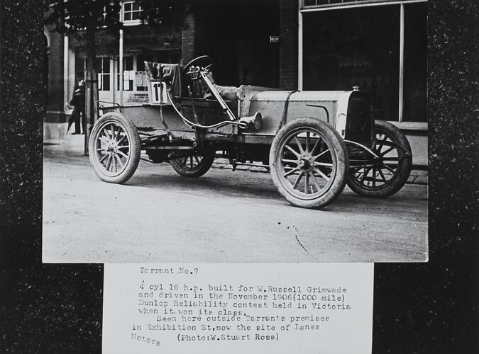 Printed in black on label below image in photograph: 'Tarrant No. 7 / 4 cyl 16 h.p. built for W. Russell Grimwade / and driven in the November 1906 (1000 mile) / Dunlop Reliability contest held in Victoria / when it won its class. / Seen here outside Tarrants premises / in Exhibition St,now the site of Lanes / Motors / (Photo : W.Stuart Ross)'