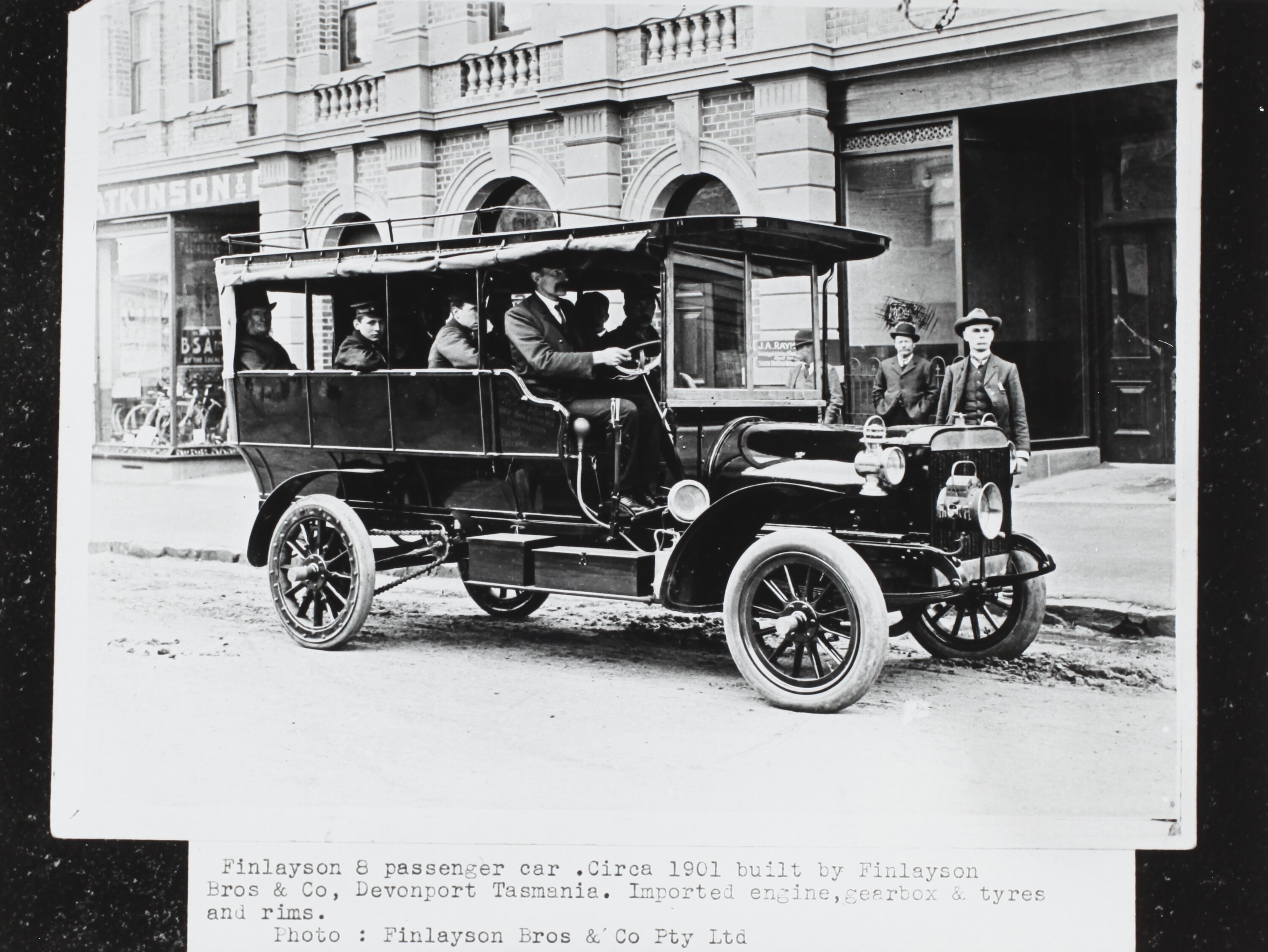 Photograph of image and text. Image shows a Finlayson 8 passenger car built by Finlayson Bros & Co, Devonport, Tasmania. Men sitting in the vehicle and standing to the right of it. Buildings are shown in the background including a bicycle shop advertising BSA products.