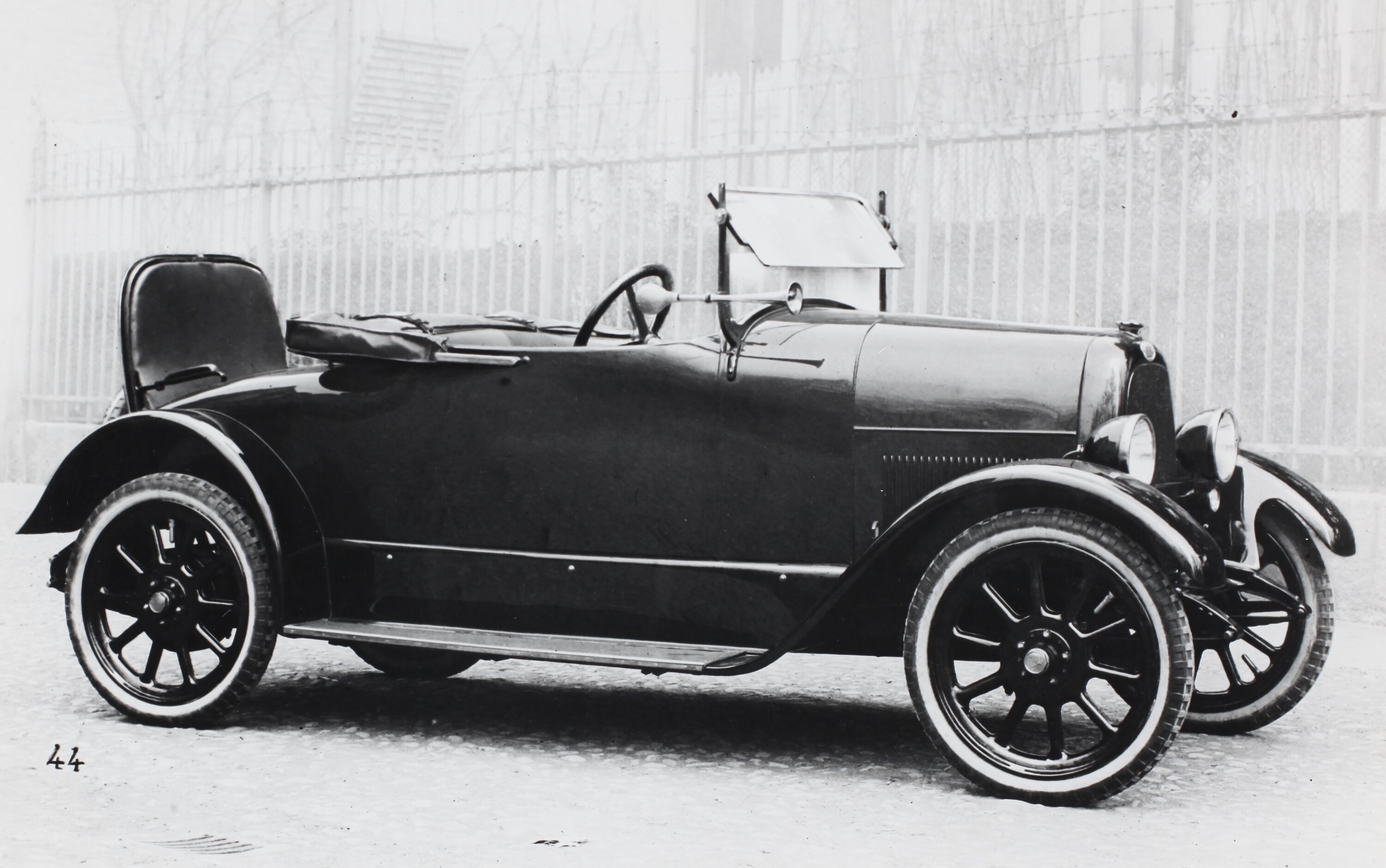 Printed in black ink on the back og photograph: 'Fiat 501 spider' Written in black on photograph: '44'