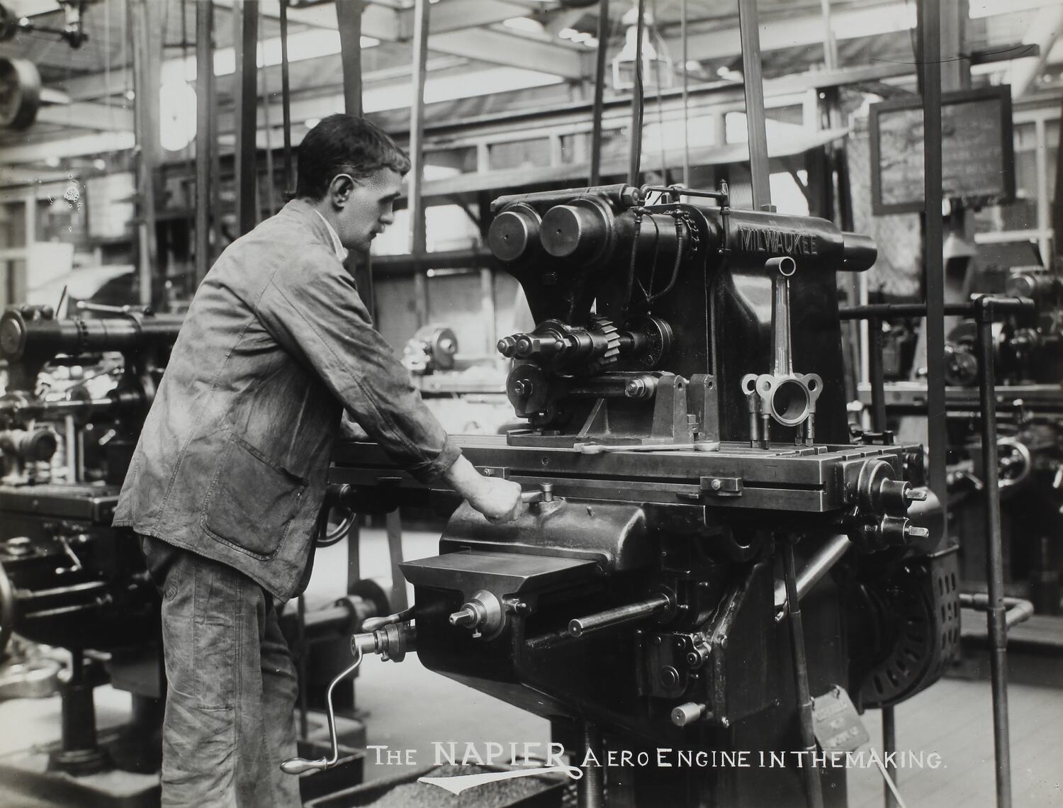 A workman operating a Milwaukee milling machine on connecting rods during production of Napier Lion aero engines at Acton, West London.