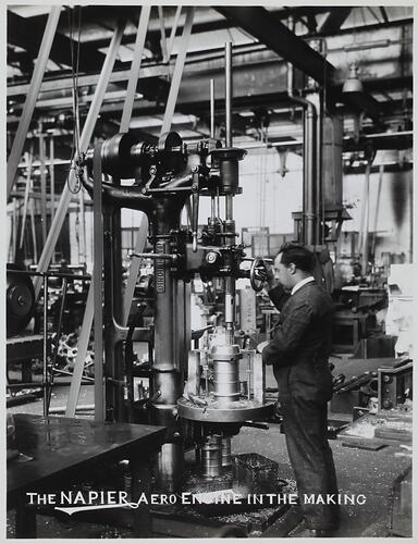 Printed in white text on photograph: 'THE NAPIER AERO ENGINE IN THE MAKING.' Hand written in grey pencil on back of photograph: '283'