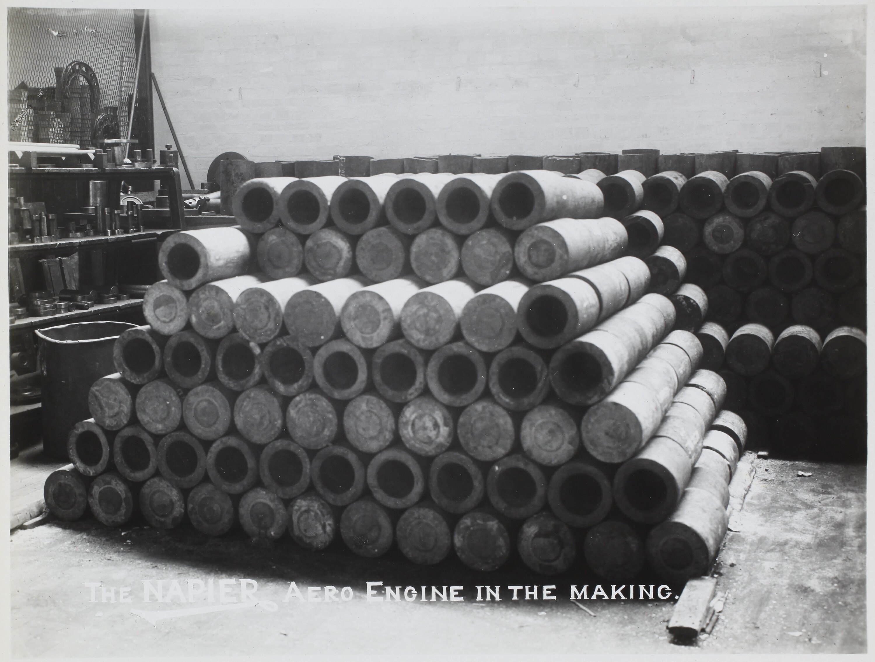 Stacked steel billets to be used during production of Napier Lion aero engines at Acton, West London.