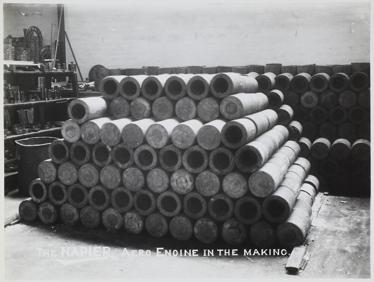 Printed in white text on photograph: 'THE NAPIER AERO ENGINE IN THE MAKING.' Hand written in grey pencil on back of photograph: '281'