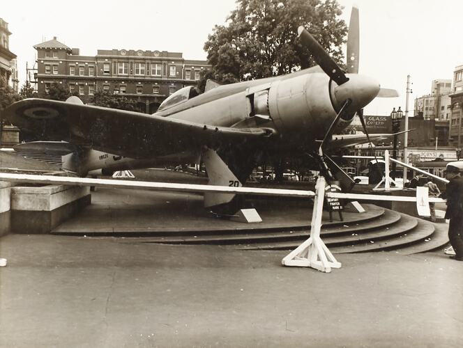 Hawker Sea Fury fighter, Royal Australian Navy on display in the forecourt of the Museum of Applied Science in Swanston Street. The aeroplane (VW626) is on display as part of an exhibition on the Jubilee of Flight in July 1953.