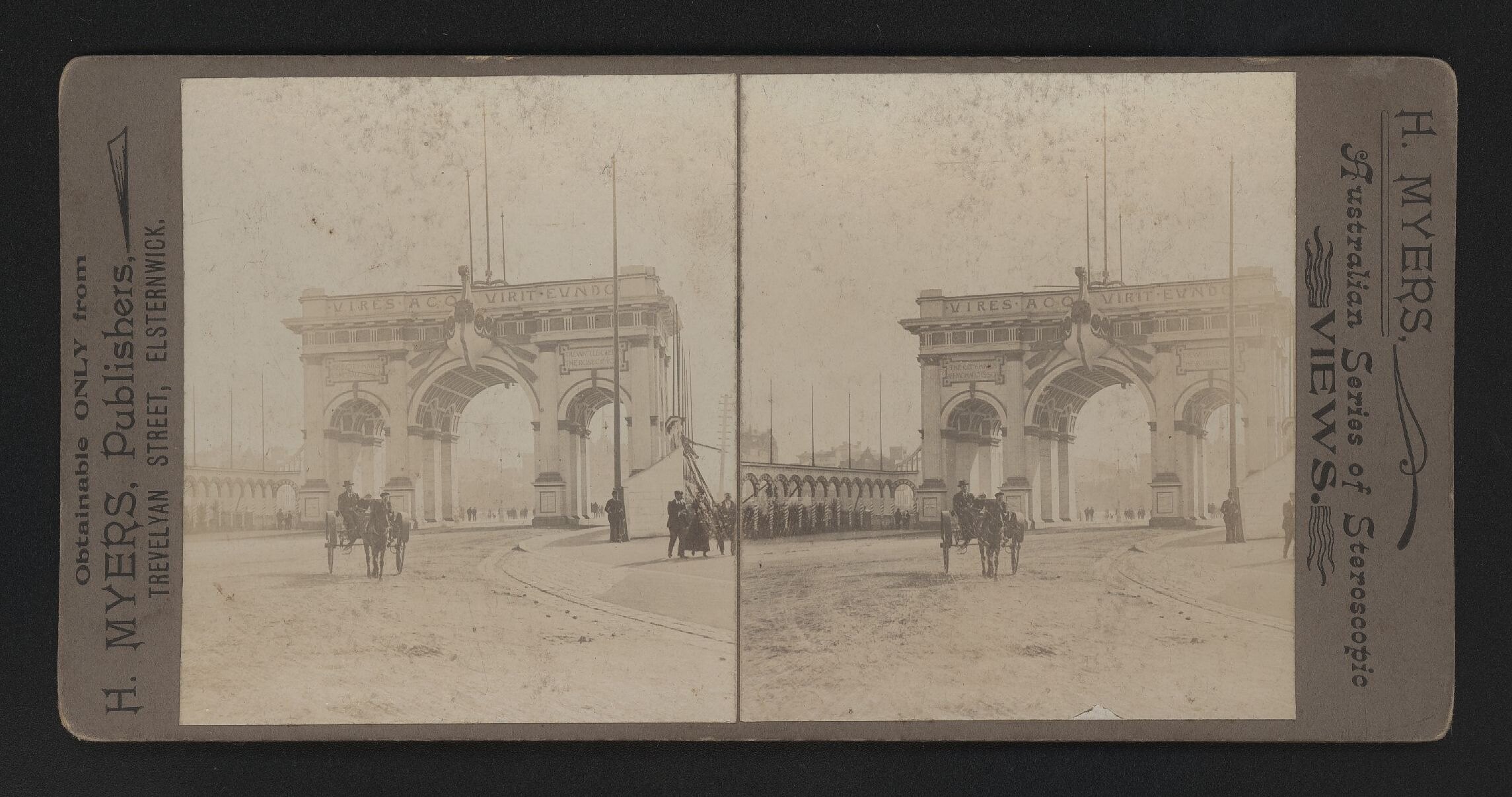 Mounted stereograph depicting the Municipal (or Corporation) Arch, Princes Bridge, from the southern side. It is part of the G. H. Myers Collection which consists of 73 photographs taken by Godfrey Henry Myers, an electrician and amateur photographer, in Melbourne during May 1901. 72 of these photographs depict preparations for the celebrations that surrounded Federation; all but one are glass stereographs.