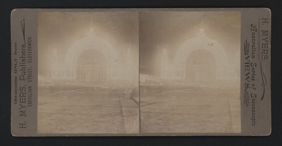 Printed on backing rh margin: H. MYERS, Australian Series of Stereoscopic/ Views. Printed on backing lh margin: Obtainable ONLY from/ H. MYERS, Publishers,/ TREVELYAN STREET, ELSTERNWICK./ Copy - Direct from Original Negative.
