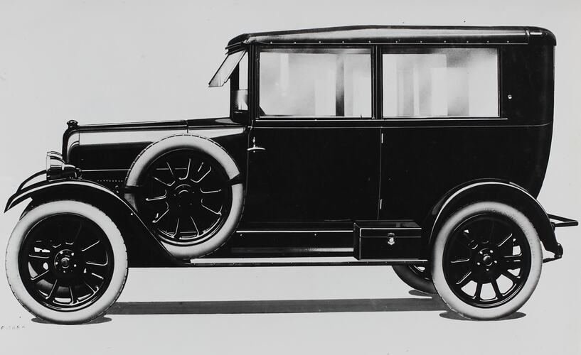 Printed in gey ink on the back of photograph: 'Agfa (repeated)' Printed in black ink on the back of photograph: 'Fiat 501 torpedo' Printed in black ink on white paper attached to the back of photograph: 'FIAT 501 / At the end of the 1st WW, many european factories, profitting by / the propitius times of the post-war period, continued making the / models of 1914, while Fiat, the only firm in Europe, produced / in 1919 a new and revolutionary car: type "501". / (extensive text)'