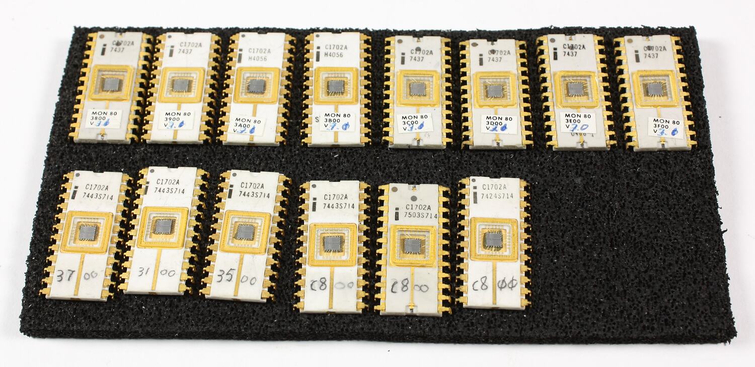 Fourteen Erasable Programmable Read Only Memory (EPROM) chips, type 1702A-6, manufactured by Intel. It is used in microcomputers and can hold 256 word x 8 bits of data with an access speed of 1.5µs. The memory can be erased by exposing the chip to ultraviolet light.