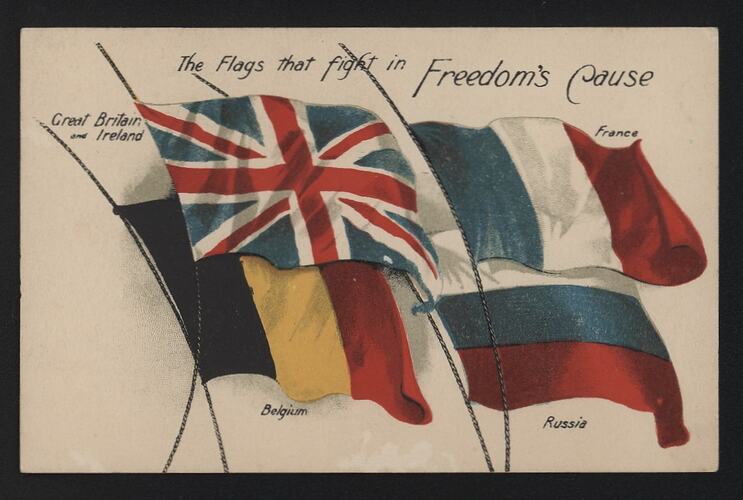 The firm of W.N. Sharpe Ltd published a series of patriotic postcards spanning the years of the Boer, or South African War (1899-1902) and the First World War (1914-18). Although the postcard is unissued and not post-marked, it depicts the four major allied countries during the early years of the First World War, Great Britain & Ireland, Belgium, France and Russia. America entered the war in 1917, following the sinking of the passenger liner, the Lusitania, by a German submarine, U-20.