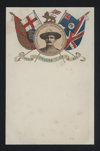 Printed on recto, upper: COLONEL BADEN-POWELL - DEFENDER OF MAFEKING/ EITHER CONQUER OR DIE Printed on verso, upper: POST CARD. / ADDRESS ONLY TO BE WRITTEN ON THIS SIDE./ AFFIX STAMP.