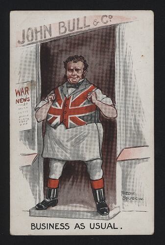 Printed on recto, upper: JOHN BULL & Co. Printed on recto, lower: BUSINESS AS USUAL. Printed in image, lh margin: WAR/ NEWS Signed on rector, lr corner: FREDK./ SPURGIN. Printed on verso, upper: POST CARD. / THIS SIDE FOR CORRESPONDENCE. THIS SIDE FOR ADDRESS. / STAMP HERE. Printed on verso, lh margin: Inter-Art Co., Red Lion Square, London, W.C./ "PATRIOTIC" Series V. No. 861. British Manufacture. Handwritten on verso, black ink: To Walter with love/ from Dick xxx